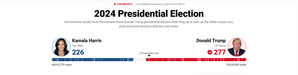 Fox News currently has Trump with a total 277 electoral votes and Harris with a total of 226. According to Fox News’s numbers, even if Harris winsteh remaining states of Alaska (3), Arizona (11), Minnesota (15), and Nevada (6) she has no chance of coming back.